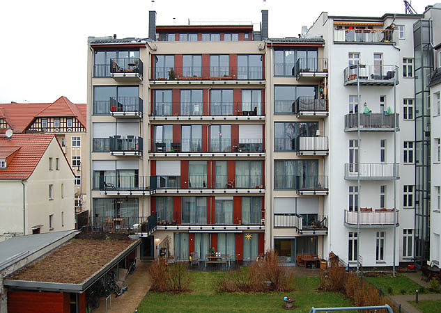| Baugemeinschaft - Blankenburger Str. 14Das Grundstück liegt nördlich am Schlosspark Pankow-Niederschönhausen. Auf 1200 m² sind 13 Wohnungen in Vorderhaus und Gartenhaus entstanden. Das Vorderhaus hat 6 Geschosse und