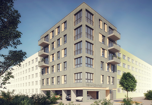 Auf fünf Geschossen wurden ein Therapiezentrum und 6 Wohnungen geplant. Im Erdgeschoss gibt es 6 PKW Stellplätze, Fahrradstellplätze und Nebenräume.  Auf dem Dach ist eine Gemeinschaftsterrasse vorgesehen.