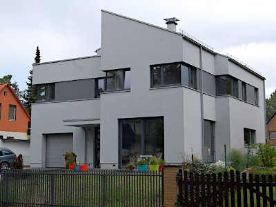 | Wohnhaus in BerlinNeubau eines Wohnhauses im Norden von Berlin. Das Gebäude ist in massiver Bauweise mit Außenwänden aus Kalksandstein, Wärmedämmverbundsystem in Mineralwolle und Geschossdecken aus Stahlbeton errichtet. Es ist nicht unterkellert. Das Gebäude entspricht den erhöhten Anforderungen an den Wärmeschutz des KfW-Effizienzhaus 70. Sommerlicher Wärmeschutz und Verschattung werden durch außenliegende Raffstore gewährleistet. Fußbodenheizung und Warmwasser sind durch eine Solaranlage unterstützt. Die Lüftungsanlage gewährleistet den Luftaustausch der Räume und Energieeffizienz. |